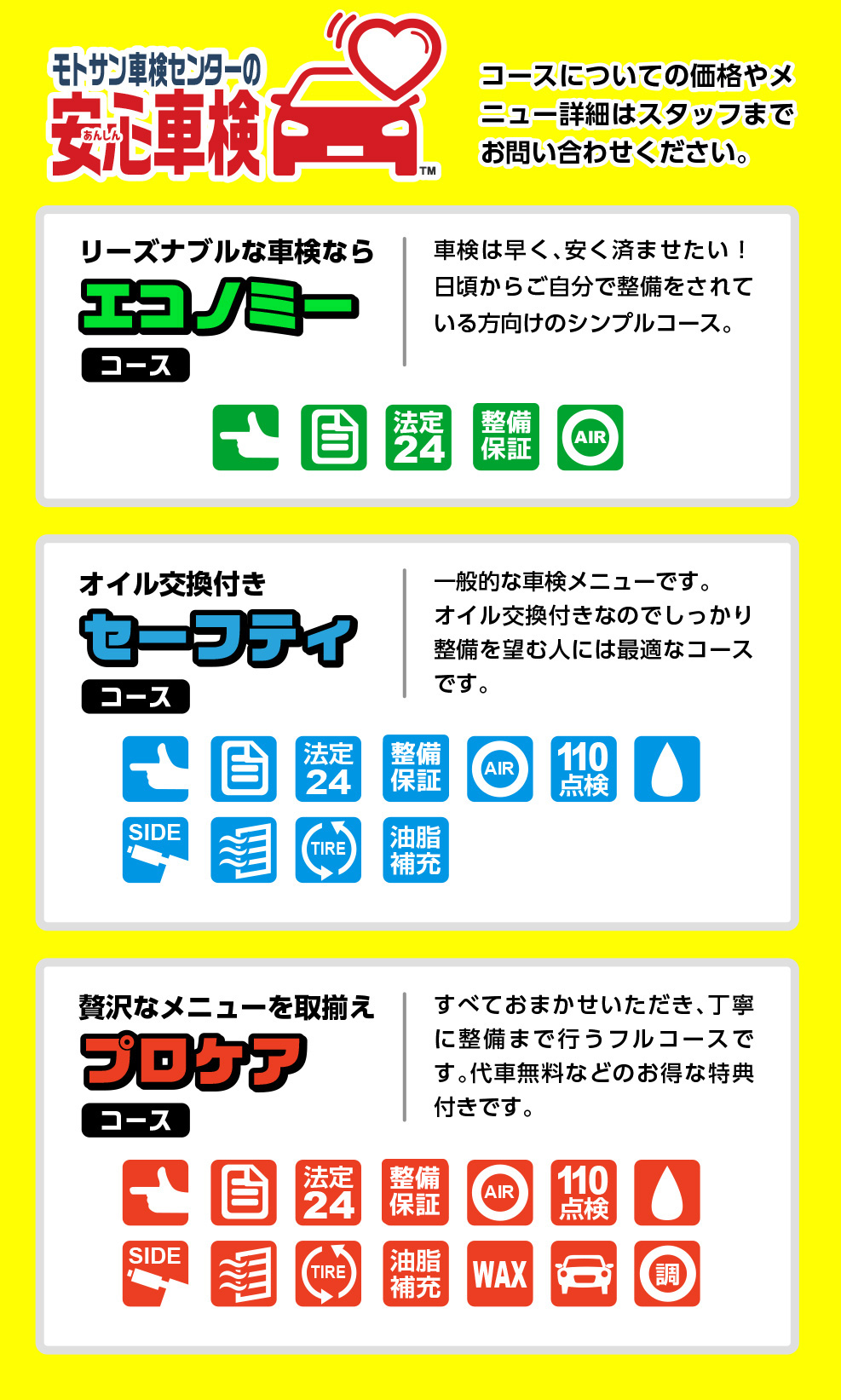 ※追加整備代及び部品代は別途料金となります。 ※部品交換修理した箇所は6ヶ月又は1万kmの整備保証付となります。 ※リヤダブルタイヤ車は別途16,500円(税込)が加算されます。 ※キャンピング車は別途5,500円(税込)が加算されます。 ※上記車検コースはすべて事前に点検見積もりをお受けいただいた後、一泊二日の料金となります。 ※重整備が伴う車検の場合、一泊二日でお受けできない場合があります。 ※下廻り洗浄及び錆止め塗装は別途料金となります。 ※違法改造車の車検はお受けできません。 ※上記車種以外(事業用・8ナンバー登録車、バイクなど)はお問い合わせください。 ※放置(駐車)違反金を滞納している場合、新しい検査証の交付を受ける事はできません。※モトサン車検センターの安心車検のコースにつきましては、予約時に詳細をお伝えいたします。